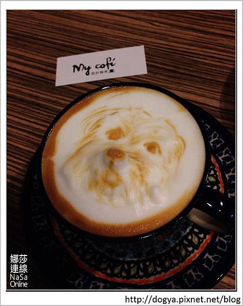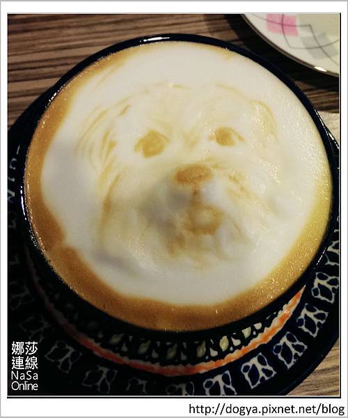 我指定的是我家的狗狗(莎莎),拿著手機的照片給拉花師拉花即可,